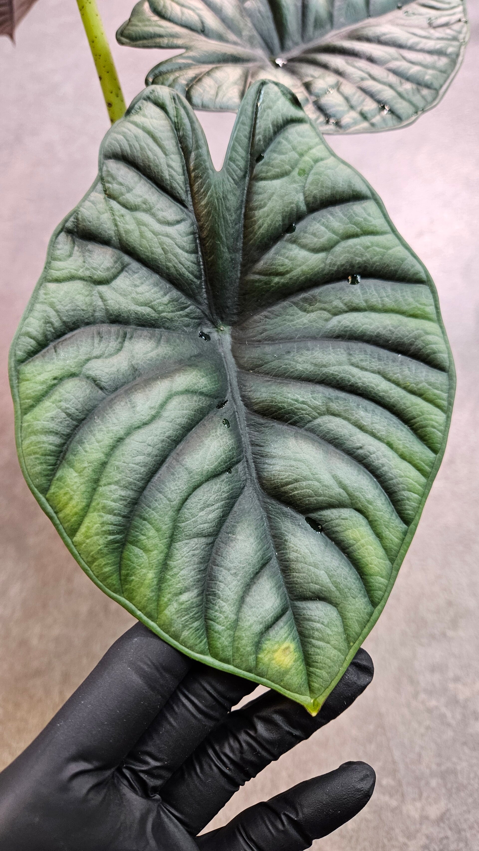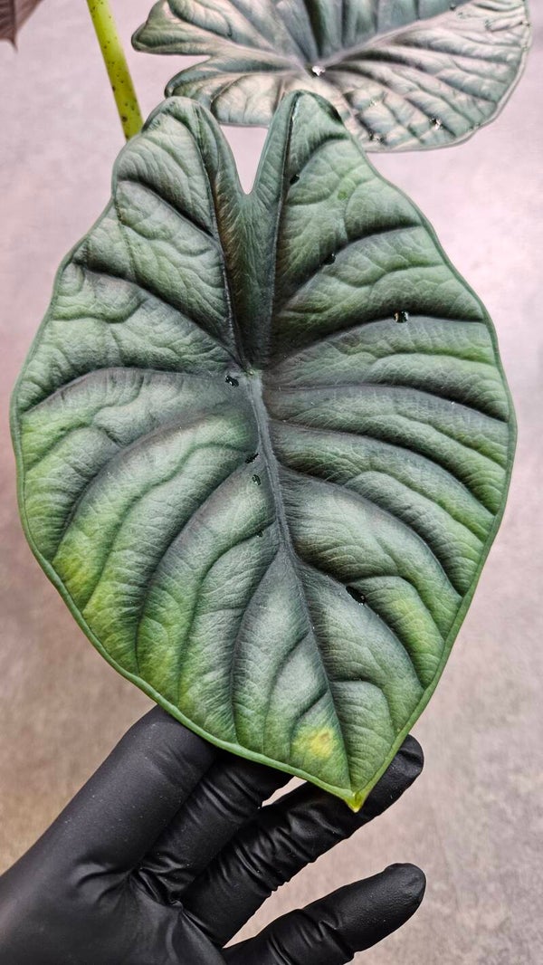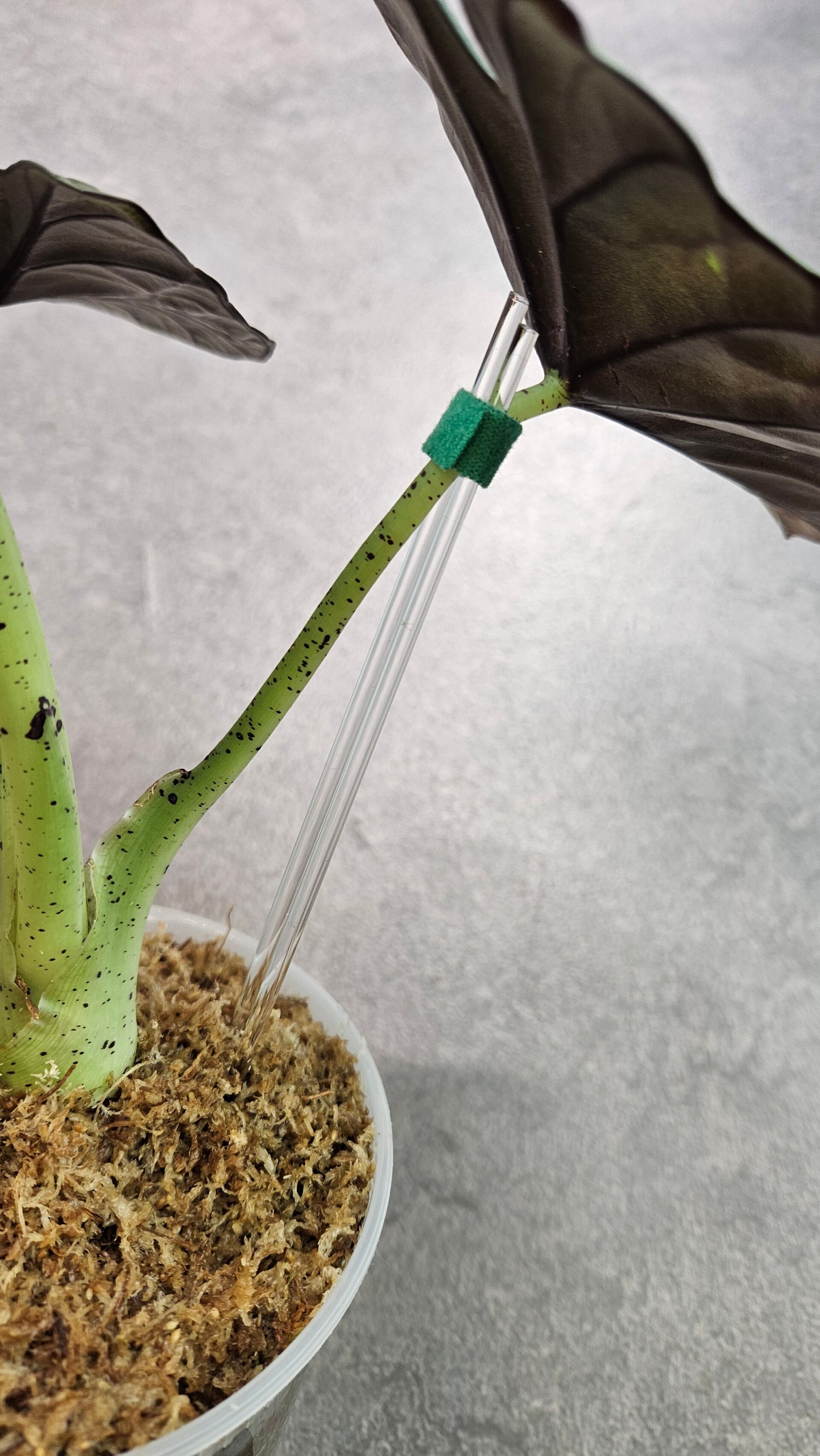 Hij is inmiddels goed geacclimatiseerd buiten de kas en is bezig met het vormen van een nieuw blad. Het oudste blad zal daardoor binnenkort afsterven, maar krijgt op dit moment nog een beetje ondersteuning.