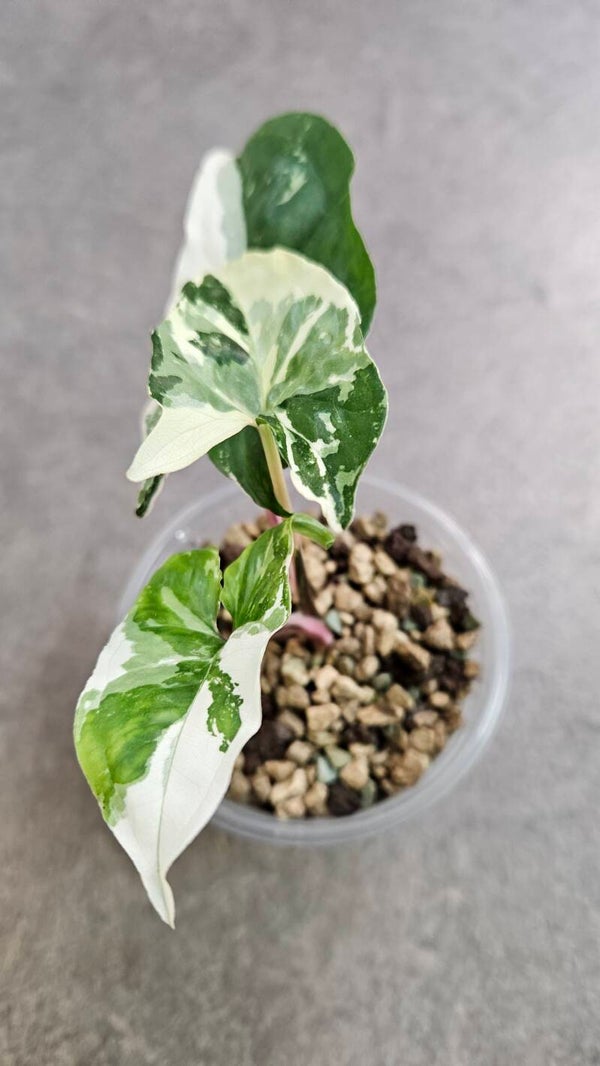 Een zeer mooie Albo Variegata, met wederom een pracht verzameling van kleuren op haar bladeren, variërend van donkergroen tot spierwit met het prachtige roze in de stam. Geef beperkt water om het wit mooi te houden.
